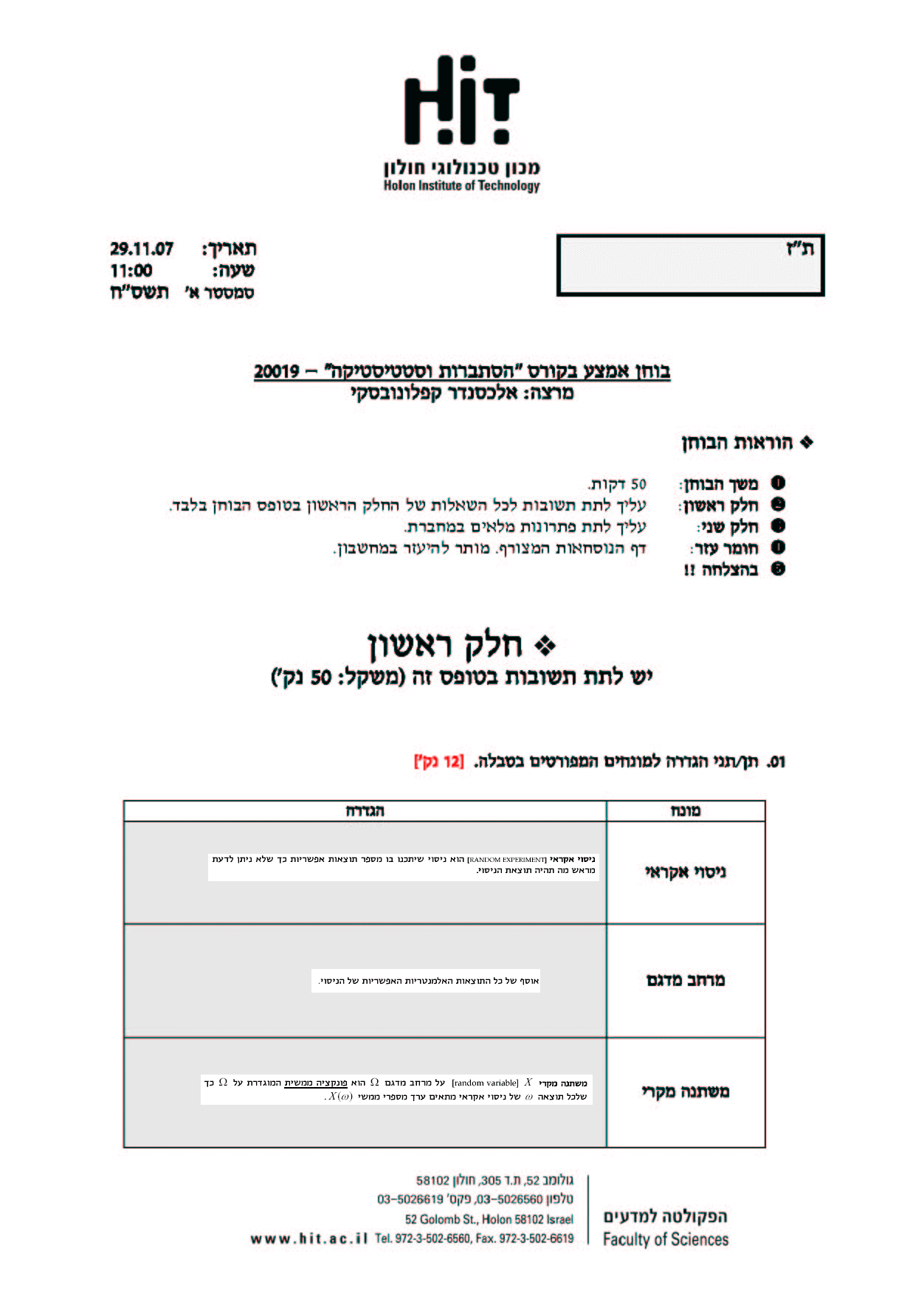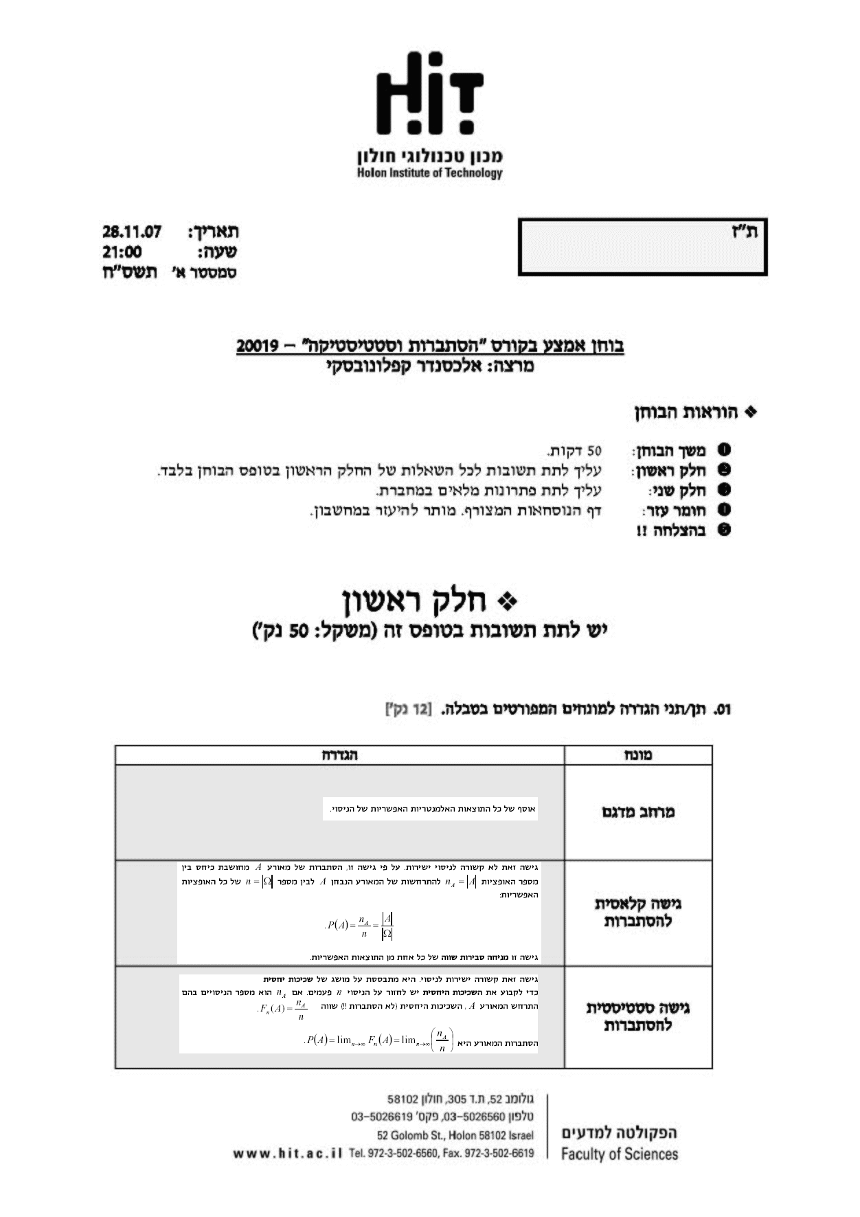 | Probability and Statistics | Lecture | 24420310-1 | Wednesday | 13:00-16:00 | Room 03.1.19 |